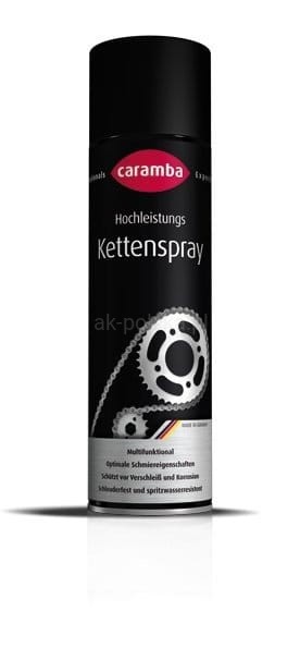 Specjalność sprayu do łańcuchów motocyklowych Caramba polega na niskiej lepkości i zawartych w nim dodatkach, co czyni go specjalnym produktem do łańcuchów napędowych o wysokich prędkościach obrotowych. W szczególności motocykle stawiają duże wymagania łańcuchom, które mimo wysokich prędkości muszą być zawsze odpowiednio smarowane. Smar w sprayu do łańcucha motocyklowego wnika szczególnie głęboko we wszystkie punkty smarowania i po odparowaniu rozpuszczalnika tworzy przezroczystą warstwę smarującą, która jest odporna na wyrzucanie, wodę i ciśnienie. Specjalne dodatki zmniejszają tarcie, a tym samym zużycie, a także skutecznie zapobiegają korozji. Spray nadaje się zarówno do oringów, jak i jeszcze bardziej przyjaznych dla smarowania pierścieni X lub Z.