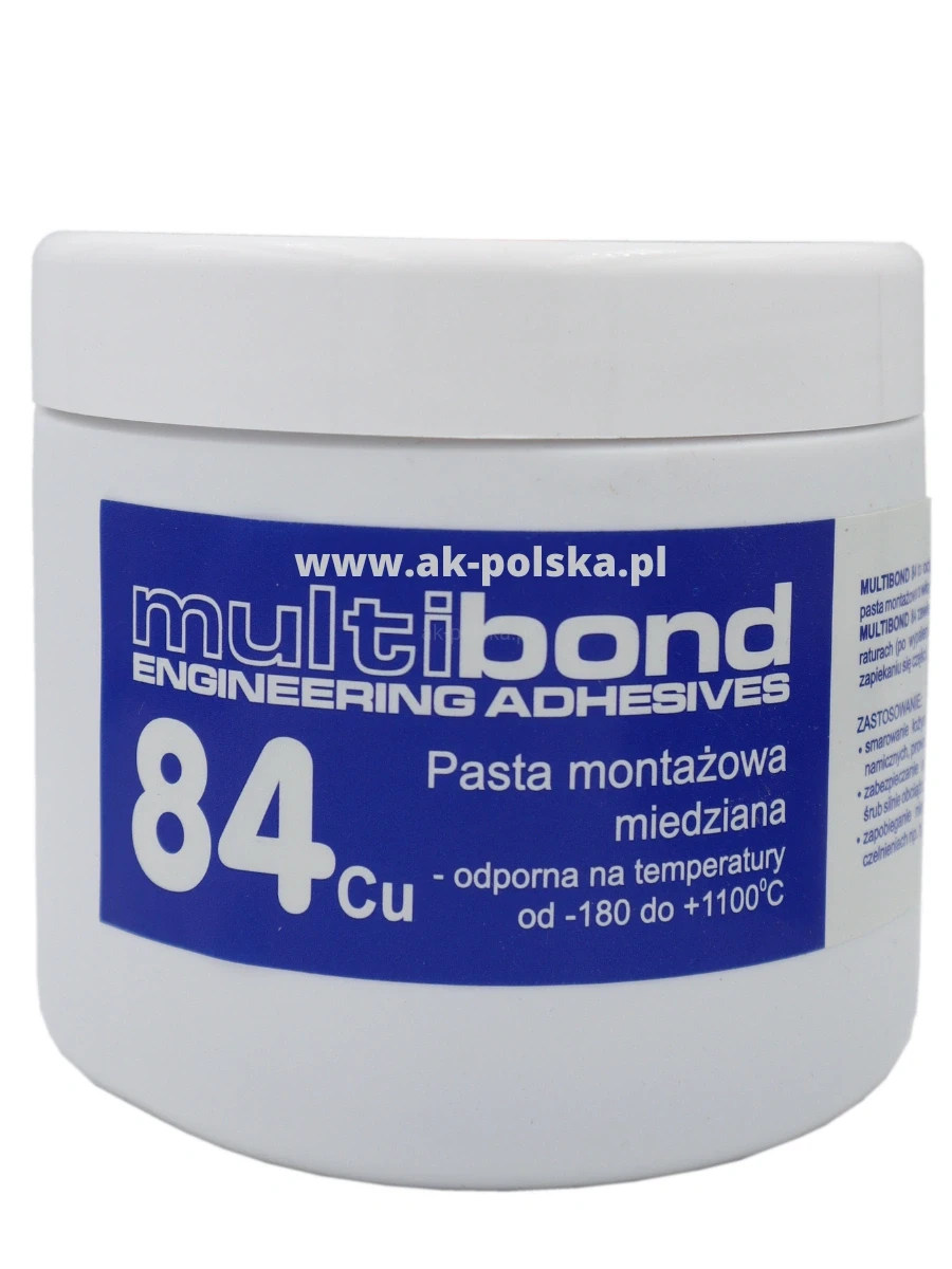 Profesjonalna, pasta montażowa typu "Anti Seize" z dodatkiem miedzi Multibond. Dobra przewodność cieplna, dobre właściwości smarne w wysokich temperaturach. Pasta montażowa ma zastosowanie w ciężko obciążonych mechanizmach wolnobieżnych, uzywana jest również do smarowania śrub, sworzni, przegubów. Zapobiega zatarciom. Smar miedziowy ma wysoką odporność termiczną do +1100oC.