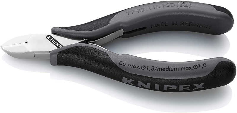 Precyzyjne szczypce do wyjątkowo dokładnego cięcia, np. w elektronice i mechanice. Rękojeści w wersji rozpraszającej ładunki elektrostatyczne. Precyzyjne złącze wsuwkowe. Podwójna sprężyna rozwierająca o niskich parametrach tarcia, zapewniająca delikatne i równomierne otwieranie narzędzia. Polerowanie na wysoki połysk wraz z cienką warstwą oleju doskonale zabezpiecza narzędzie przed korozją. Ostrza oddzielnie hartowane indukcyjnie. Rękojeści z wielokomponentowymi nasadkami, czarno-popielate. Główka okrągła, bez ścięcia. Twardość ostrzy ok. 57 HRC. Główka tnąca: specjalna stal narzędziowa, kuta, hartowana olejowo.