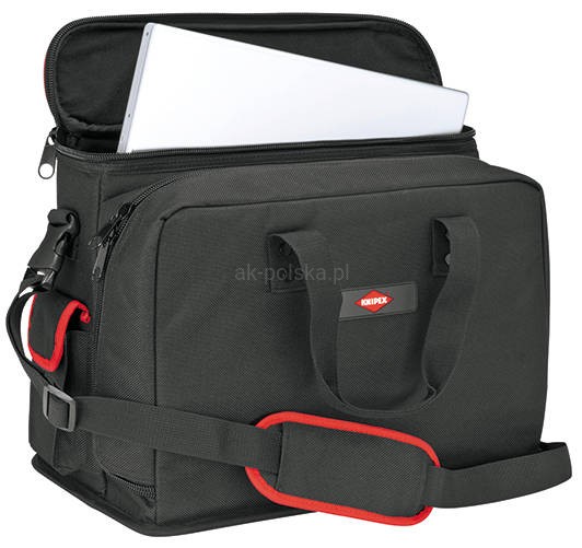 Wyścielana kieszeń wewnętrzna na notebook i dokumenty DIN A4, dodatkowa kieszeń wielkości DIN A4 zamykana na zamek. Kieszeń przednia z 8 kieszonkami i 1 mała kieszeń wewnetrzna, rozkladana pod kątem 90°. Strona tylna kieszeni zewnętrznej posiada 5 uchwytów na narzędzia i 3 uchwyty na długopisy. 1 wyjmowana ścianka wewnętrzna z 8 uchwytami na narzędzia od strony górnej i 2 rzędami elastycznych pętli od strony dolnej. Pojemnik denny zabezpieczony przed przedostawaniem się kropel wody. Regulowany pasek z zapięciem. Z dwoma uchwytami. Z wytrzymałej tkaniny poliestrowej
